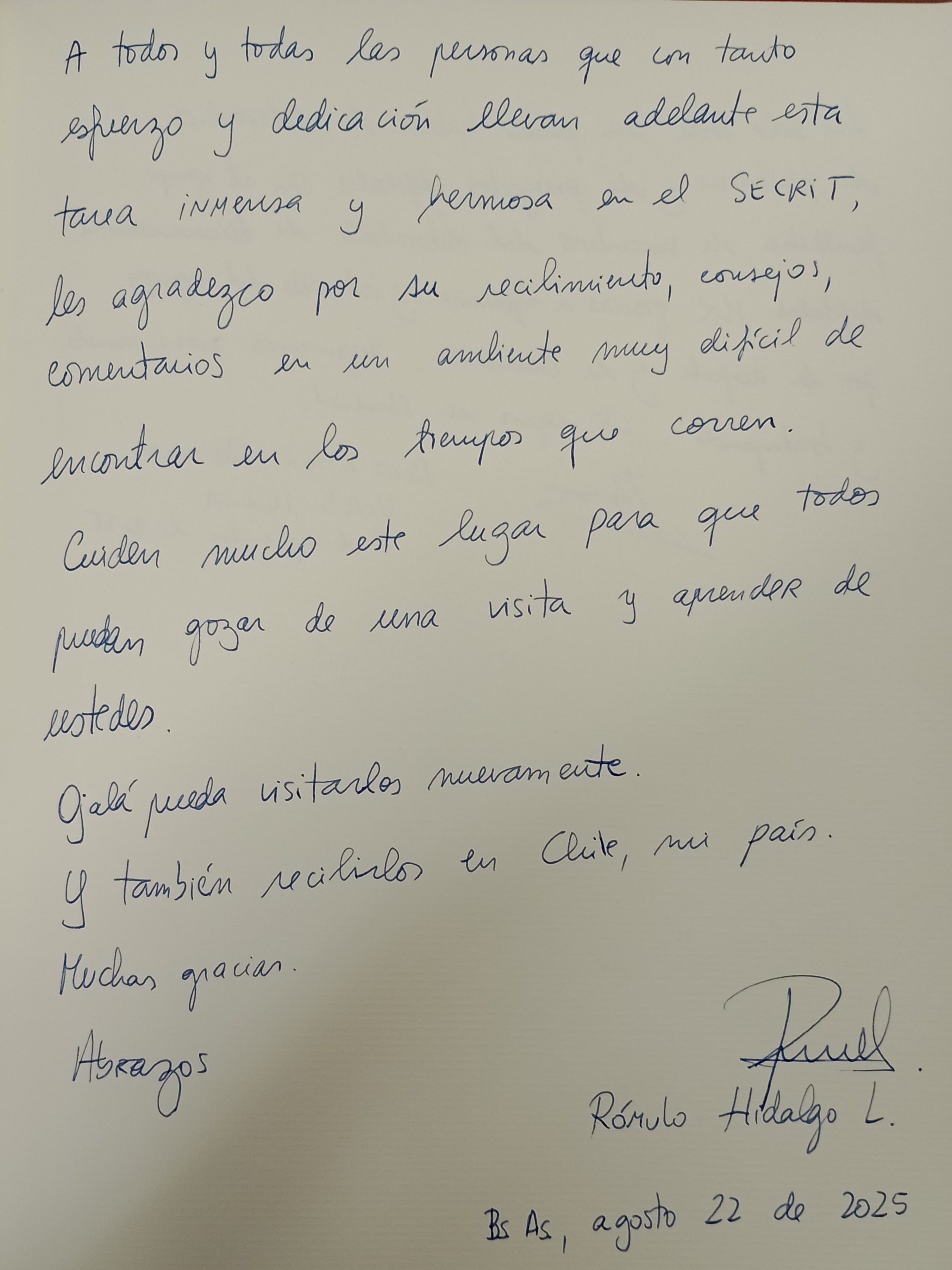 Es una enorme alegría visitar el SECRIT, conocerlo y conversar con Mercedes, Juan José y todos estos nuevos amigos en los libros y proyectos, recuperar muchos tramos de mi historia que me esperaban en Argentina, y celebrar el diálogo y el encuentro de la sensibilidad y la inteligencia. Un gran y permanente abrazo que dure hasta mi regreso, y ¡que viva la hospitalidad del libro, la biblioteca, los maestros y maestras, la lectura!